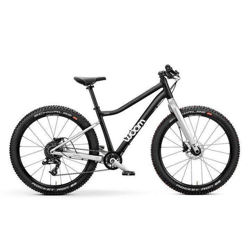 | superleichte woom OFF DISCO TEC Doppelkammer-Felgen aus Aluminium, Alu-Naben mit gedichteten Industrielagern, Steckachsen für höchste Steifigkeit (100 x 15 mm vorne / 135 x 12 mm hinten), 20 G14-Speichen, zweifach gekreuzt eingespeicht, Alu-Nippel |