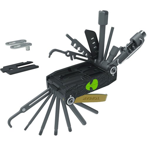 Topeak Alien X Multi ToolThe Alien X Multi Tool is Topeak's next evolution of their legendary pro workshop quality multi tool. It features 40 functions, folds down for easy storage and separates into two pieces for easy access and full leverage and control when using each tool. Engineered and Equipped for Modern Bike MaintenanceThe Alien X features T10 / T15 / T20 / T25 T30 Torx heads, power link pliers for use on master link equipped single and multi-speed chains. Plus, it includes an extended range of Allen keys, spoke wrenches, screwdrivers, anodised tyre levers, valve tools, spoke holders and more. Also, it has a rivet anvil for Campagnolo hollow pins, a secondary chain link fence and chain pin breaker, chain link storage compartment, a tool lock and protective knife cover. Features: Size: 7.8x4.5x4cm 1.5-L, 2-L, 2.5, 3, 4, 5, 6, 8mm Allen 10mm Allen socket 8, 9, 10mm box wrenches 15mm open wrench T10, T15, T25 Torx wrench T30 Torx socket 14G, 15G, Mavic m7, Shimano 4.5mm spoke wrenches Chain tool Chain hook Power link pliers Super hard anodized tyre lever #2 Phillips, flat head screwdrivers Serrated knife and saw with cover Presta valve tool Spoke holder Disc pad spacer Chain pin breaker Chain link storage compartment Self-tightening tools 1800 denier nylon bag Weight: 204gBuy Topeak Accessories from Chain Reaction Cycles, the World's Largest Online Bike Store.