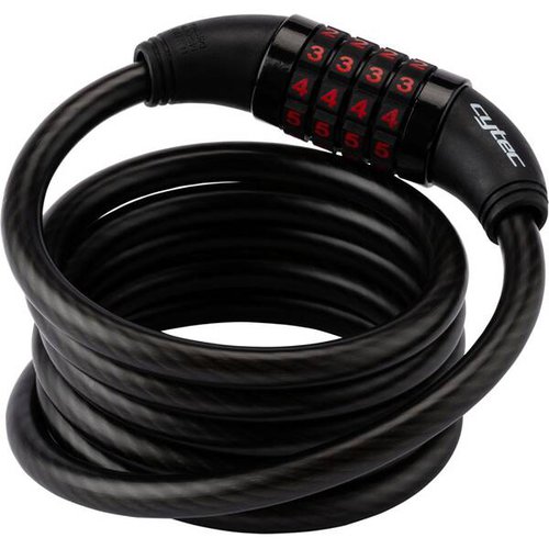 Spiralkabelschloss mit 4er Zahlenkombination frei wählbar, 180 cm langes Stahlkabel mit Kunststoffmantel 10 mm Durchmesser, inklusive universeller Rahmenhalterung.