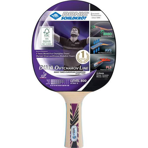 Der "Dima Ovtcharov 800 FSC" von Donic-Schildkröt ist ein sehr komfortabel zu spielender Tischtennisschläger dieser zukunftsweisenden Schlägerserie. Alle Schläger dieser Serie sind aus FSC-zertifiziertem Holz hergestellt, das aus kontrolliert nachhaltigem Anbau stammt. Optimal geeignet für den ambitionierten Freizeitsport und das regelmäßige Hobbyspiel ist dieses Modell mit einer hochwertigen Holz- & Griffqualität ausgestattet, der ITTF-zugelassene Champion-Belag aus dem Hause Schildkröt punktet mit sehr gutem Grip und überträgt den Spin sehr effektiv auf den Ball. Der zwischen Belag und Holz befindliche 2,0 mm starke Schwamm generiert ein hohes Maß an Power, schnellere Ballgeschwindigkeiten bei gleichem Krafteinsatz sind der Vorteil gegenüber einem dünneren und somit preiswerter herstellbaren Schwamm. Der ERGO-Griff mit abgerundetem, fließendem Übergang vom Griff zum Schlägerblatt liegt deutlich besser in der Hand als klassische Schläger und vermeidet Druckstellen am Zeigefinger.
