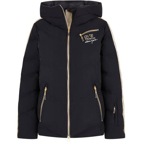 Die Skijacke von CANYON hat einen matten schwarzen Oberstoff und eine leicht diagonale Steppung. Die Skijacke besticht durch ihre vielen goldenen Details. Entlang der Ärmel und an der Kapuze befindet sich ein goldener Besatzstoff und auch der Zwei-Wege-Reißverschluss, sowie die seitlichen Taschenzipper sind in gold gehalten. Die Skijacke kommt mit einer großen Kapuze, die mit einem weichen Fleecestoff gefüttert ist. Die Kapuze lässt sich innen mit einem Kordelzug verstellen. Am Ärmel ist noch zusätzlich eine Skipass-Tasche verarbeitet und der Artikel hat einen herausnehmbaren Windfang.