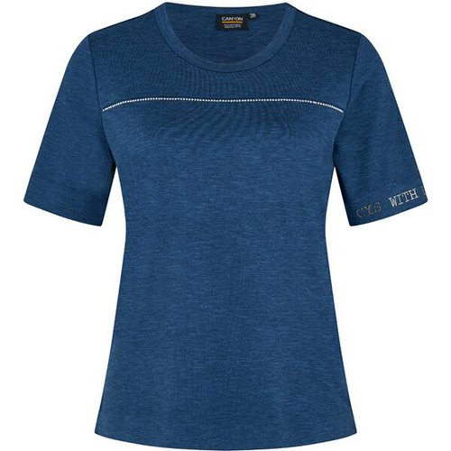 Das unifarbene CANYON T-Shirt mit längerem Halbarm und einem Rundhalsausschnitt hat eine Nietenborte über der Brust und eine Nietenschriftverzierung am linken Oberarm. Das Material liegt sehr angenehm auf der Haut.
