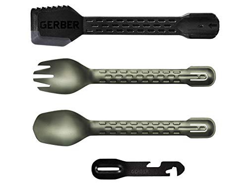 Umfangreiches Multifunktions-Essbesteck als praktischer Allzweck-Wegbegleiter bei Camping, Outdoor-Aktivitäten und Survival\nLöffel, Gabel und Rührstab/Pfannenwender mit Teilwellenschliff zum Schneiden, Kein Zerkratzen von Pfannen dank partieller Silikonbeschichtung\n4 in 1 Multifunktions-Tool: Schälmesser, Dosenöffner, Flaschenöffner und gezacktes Ende zum Aufreißen von Verpackungen\nEinfaches Zusammenstecken für platzsparendes Verstauen in jeder Tasche, Unregelmäßige Oberflächenstruktur für festen Halt bei jedem Wetter\nLieferumfang: 1 x Gerber ComplEAT Cook Eat Clean Tong, Länge: 19,7 cm, Gewicht: 65 g, Material: T6 Aluminium, Farbe: Grün, 31-003468