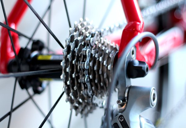 Das Foto zeigt eine externe Kettenschaltung mit Schaltwerk.