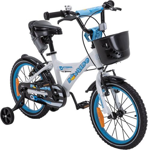 Actionbikes Motors Kinderfahrrad Kinder Fahrrad BMX Donaldo inkl. Korb - weiß / blau, 1 Gang, ohne Schaltung, (16 Zoll, ab 105 cm Körpergröße, max. Zuladung 40 kg, abnehmbare Stützräder, Klingel, Trinkflasche inkl. Halterung, Reflektoren, Antirutschgriffe, Lenkerschutz, 1-tlg., V-Brake-Bremsen, Luftbereifung, Schutzbleche, weiß / blau), höhenverstellbares Bike Jungen Mädchen Rad Kinderrad ab 4 Jahre |