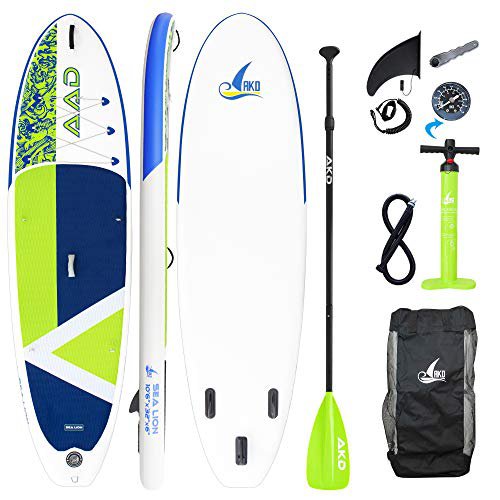 SeaLion 10'6" Allzweck-Paddle-Board, das breite und stabile Design ist perfekt für geeignet für Anfänger und Fortgeschrittene, geeignet für das Paddeln auf Seen, Flüssen und Meeren, auch geeignet für Yoga und Angeln.\nGröße: 320x81x15cm/318L, die optimale Belastbarkeit beträgt ca. 40-150kg, daher geeignet für 1-2 Erwachsene, Kinder oder Haustiere, um gemeinsam bequem auf dem Wasser zu paddeln. In Verbindung mit dem Sitz und dem Doppelpaddel kann es als Kajak verwendet werden.\nAKD-SUP Board werden aus umweltfreundlichem und dichtem Fallnadelmaterial und fortschrittlicher Produktionstechnologie hergestellt. Dadurch sind ist das Board druckbeständiger und sehr stabil und langlebig, resistent gegen UV- und Seewasserkorrosion und die erste Wahl für den Umweltschutz. Außerdem bietet AKD eine 2-jährige Garantie.\nDer optimale Druck des Boardes liegt bei 15psi. an diesem Punkt verhält sich das Brett sehr gerade und steif, wodurch es länger hält und sich nicht verformt. Natürlich halten auch unsere Paddel einem maximal sicheren Druck von 20 psi stand.\nDas Paddel ist aus hochwertigem 1,2mm dickem Aluminium-Legierung, die den Vorteil von geringem Gewicht, Haltbarkeit und hervorragende Sport Leistung hat. Er kann kurzzeitig auf dem Wasser schwimmen und die Länge kann zwischen 1,7 und 2,08 Metern eingestellt werden.