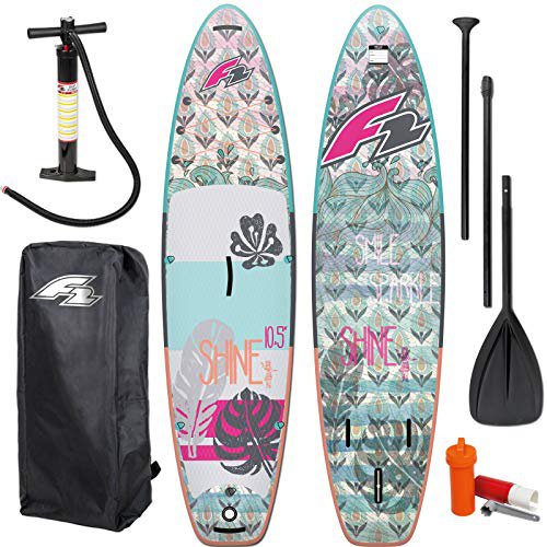 Das F2 SHINE 10'6" ist ein Allrounder im SUP-Bereich. Die neue Form vereint alle Allround-Features, bewährt sich sehr gut als Familienboard und hat eine Nutzlast von ca. 120kg.\nDas Board fährt sich anfängerfreundlich und bringt sehr stabile Fahreigenschaften mit sich.\nDas sehr leichte Boardgewicht (8,6 kg) sorgt für schnellere Beschleunigung, leichte Drehbarkeit, Kontrolle und Sicherheit.\nMaße (L x B x H): 323 x 80 x 15 cm / Volumen: ca. 320 Liter / maximales Benutzergewicht: ca. 120 kg\nLieferumfang: F2 SHINE 10'6" Board, Transport Rucksack, Reparatur-Kit, eine Hochdruck Pumpe, Leash und 3-teiliges Alu Paddel