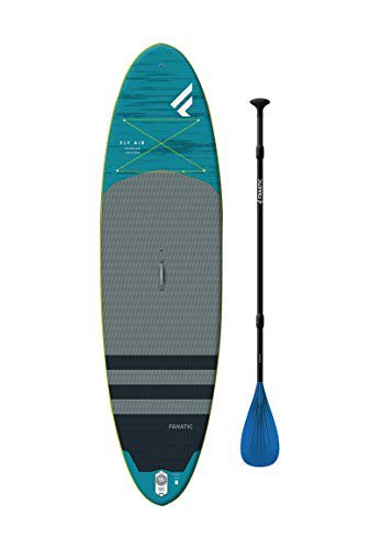 Die Fly Air ist das rundum aufblasbare SUP, das jeder genießen kann.\nUnser einfacher und stabiler Allrounder ist die perfekte Lösung, wenn Sie ein klassisches Board suchen, das von Flachwasser bis zu kleinen Wellen alles kann.\nAllround-Umriss - ideal für Anfänger und Fortgeschrittene, vom Flachwasser bis zu kleinen Wellen\nClick Fin - Thruster Fin Setup mit abnehmbarem Click Fin System - Befestigen und entfernen Sie Ihre Finne in Sekunden ohne Werkzeug. Qualitätsdruck - Volldeck- / Basisqualitätsdruck und Schienendesign für überlegene Optik. Länge - 9'8 "\nMastfoot-Einsatz - Mastfoot-Einsatz für Windsurf-Option. Decknetz - Integriertes Decknetz zum Anbringen von Gepäck. Fußpolster - Diamond Grooving Footpad für ultimativen Grip und Komfort. Tragegriff - Bequemer Tragegriff. Breite - 81,3 cm