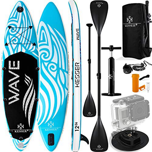 𝐀𝐔𝐅𝐁𝐋𝐀𝐒𝐁𝐀𝐑: Das KESSER Premium 305x76x15cm 10.0' Aufblasbares SUP Board Surfboard ist als Paddelboard oder Kajak verwendbar von Anfänger bis fortgeschrittene Stand Up Paddling-Fahrer. Mit der mitgelieferten Luftpumpe mit Druckanzeige schnell aufgeblasen und sofort startbereit. Das leichte 2in1 Doppelpaddel alu paddel wird einfach zusammengesteckt und kann nach Belieben an die eigene Körpergröße angepasst werden.\n𝐀𝐂𝐓𝐈𝐎𝐍 𝐂𝐀𝐌 𝐇𝐀𝐋𝐓𝐄𝐑𝐔𝐍𝐆: Nutzen Sie die praktische Action-Kamera-Halterung um ihre Paddel-Touren festzuhalten und tolle Filmaufnahmen mit Hilfe der integrierten Action-Kamera-Halterung, die mit zahlreichen Kameras kompatibel ist. Die Halterung ist bereits fest auf dem Board vormontiert.\n𝐏𝐑𝐄𝐌𝐈𝐔𝐌 𝐑𝐔𝐂𝐊𝐒𝐀𝐂𝐊: Ein praktischer Robuster Rucksack (Tragetasche) und ein Reparatur-Set im Lieferumfang Nach der Benutzung kann das KESSER SUP Board ganz einfach zusammengefaltet und in der Tragetasche verstaut werden. So sind das Board, die Hochdruckpumpe und das Paddel im Handumdrehen sicher verpackt und transportbereit.\n𝐕𝐈𝐄𝐋𝐒𝐄𝐈𝐓𝐈𝐆 𝐒𝐔𝐏: nutzbar als Stand Up Board oder Kajak Abschleppöse 11x D-Ringe zur Befestigung eines Kajaksitzes. Mit der Sicherungsschlaufe bleibt das SUP Board auch dann in der Nähe, wenn man gerade nicht darauf steht. enthält darüber hinaus ein umfangreiches Zubehör- Set.\n𝐃𝐑𝐎𝐏 𝐒𝐓𝐈𝐂𝐇 𝐓𝐄𝐂𝐇𝐍𝐎𝐋𝐎𝐆𝐈𝐄: Die Verwendung der besten auf dem Markt erhältlichen Drop Stitch Materialien gewährleisten ein unerreichtes Verhältnis von Luftdruck und Festigkeit.Die 3-lagige Kanten Konstruktion gewährleistet maximale Härte und Haltbarkeit. Diamantgefrästes Footpad Die EVA Deck Schaumstoff Oberfläche bietet ein sicheres und angenehmes Standgefühl auf dem Paddelbrett.