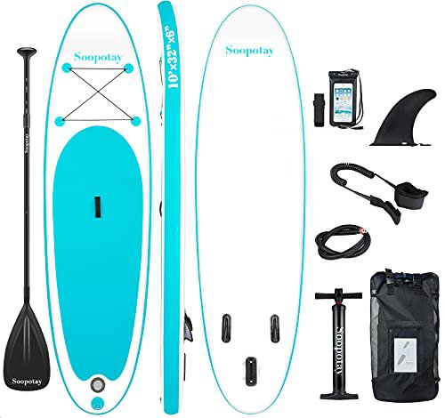 Paddelboard-Maße: Soopotay aufblasbare Paddelboards misst 25,4 x 81,3 x 15,2 cm mit einer maximalen Kapazität von 127 kg. Das aufblasbare SUP-Board wiegt nur 8,2 kg für Ihr leichtes Tragen, Aufblasen oder Luftablassen < 5 min, max. PSI: 15\nHochwertiges Material: reine Handarbeit, 0,9 mm dicke PVC-Außenschale in Militärqualität und unzählige Drop-Stitch-Innenkonstruktion, starr und leicht zu tragen, so dass die Paddelbretter am besten geeignet für Erwachsene, Anfänger oder Freizeit-Paddler, die stilvoll fahren möchten\nUltra breit und stabil während kompakt: fügt zusätzliche 5,1 cm in der Breite, 81,3 cm breit und 200+ Liter Volumen hinzu, bietet viel Stabilität für einen durchschnittlichen Erwachsenen. Kompakt, wenn es aufgerollt ist, klein in der Lagerung und praktisch für Sie, um überall zu reisen\nGroßartiges Allround-iSUP-Board-Design: geeignet für alle Fähigkeitsstufen und keine Altersbegrenzung, großartige Wahl für das Paddeln von kurzen bis mittleren Entfernungen oder beim Yoga, Angeln, Sightseeing im Flachwasser\nPaddleboard Paket enthält alle: aufblasbares Standup Paddelboard, 3 Stück SUP Paddel, Coil Leash, Center Finne, Rucksack, Pumpe, wasserdichte Telefonhülle. Wir bieten 30 Tage Rückgabe ohne Risiko + 1 Jahr Material Qualitätsversprechen + zuverlässiger After-Sales-Service, wir haben keine Angst, dass Sie uns aus irgendwelchen Gründen kontaktieren, sondern schätzen wir die Stimme der Kunden, die zur Innovation und Verbesserung eines Produkts beiträgt