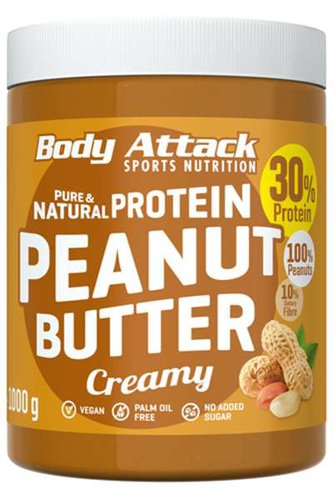 Zutaten: 100% Erdnüsse. Nährwertangaben: 100 g Brennwerte 2498 kJ / 597 kcal Fett 50 g - davon gesättigt 6,8 g Kohlenhydrate 7 g - davon Zucker 3,6 g Ballaststoffe 9,9 g Eiweiß 30 g Salz 0,02 g Allergiehinweis: Kann Spuren von Schalenfrüchten enthalten. Hersteller: BODY ATT...