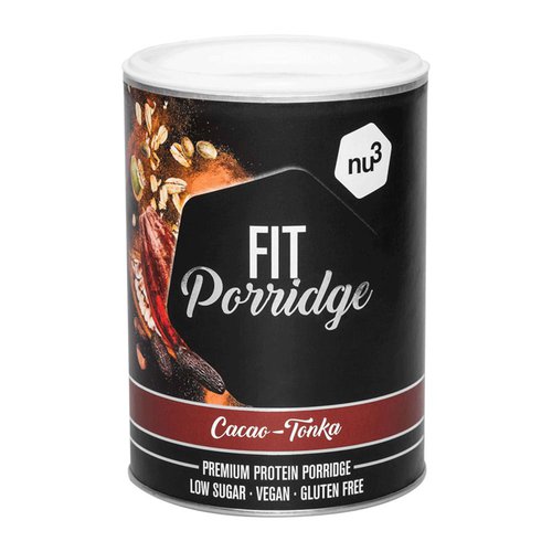 Bitte achten Sie auf eine abwechslungsreiche und ausgewogene Ernährung und gesunde Lebensweise nu3 Fit Protein-Porridge, Cacao-Tonka Mehr als 33 % pflanzliches Eiweiß Nur 1,9 g Zucker pro Portion Ohne Soja, vegan & glutenfrei Was ist drin im nu3 Fit Protein-Porridge, Cacao-Tonka? Das Fit Porridge von nu3 steckt nicht nur voller pflanzlicher Proteine aus Kürbiskernen, Lein- und Hanfsamen, sondern enthält mehr als 50 % weniger Kohlenhydrate als herkömmliches Hafer-Porridge. Kakao und gemahlene Tonkabohnen sorgen für ein schokoladiges Geschmackserlebnis mit leichter Vanille-Note. Und dank kalorienfreier Süße aus Erythrit und Stevia ist das Fit Porridge auch noch besonders zuckerarm. Was ist das Besondere am nu3 Fit Protein-Porridge? Das Fit Protein-Porridge von nu3 enthält neben 5 verschiedenen pflanzlichen Proteinquellen auch 10 % getrockneten Blumenkohl . Den schmeckst du nicht, aber er liefert Ballaststoffe und enthält nur wenige Kalorien. Außerdem ist das zuckerarme Protein-Porridge frei von tierischen Inhaltsstoffen, Soja und Gluten. So passt das vegane Fitness-Porridge in jede Ernährung! Wie bereite ich das Fit Porridge zu? Ein weiterer Vorteil des Protein-Porridge ist die schnelle Zubereitung. Für eine Portion einfach 50 g Porridge mit 75 – 100 ml heißem Wasser übergießen und drei Minuten ziehen lassen . Alternativ kannst du das Porridge auch mit 100 ml Pflanzenmilch verrühren und in der Mikrowelle erhitzen – super cremig und lecker. Zutaten: Kürbiskernproteinkonzentrat (32%), Süßungsmittel: (Erythrit, Steviolglycoside), Sonnenblumenkernmehl (12%), geschrotete Leinsamen (11%), glutenfreie Haferflocken (10%), getrockneter Blumenkohl (10%), Kakao stark entölt (6,9%), geschälte Hanfsamen (5%), Tonkabohne* (0,1%) *gemahlen Nährwertangabe: Nährstoffangabe pro 100 g pro Portion Energie 1521 KJ / 363,53 kcal 760 KJ / 181,76 kcal Fett 14,2 g 7,1 g davon gesättigte Fettsäuren 2,8 g 1,4 g Kohlenhydrate 24,3 g 12,1 g davon Zucker 3,8 g 1,9 g Ballsatstoffe 11,3 g 5,7 g Eiweiß 33,9 g 17 g Salz 0,38 g 0,2 g Verzehrempfehlung: 50 g (5 EL) mit 75–100 ml (je nach gewünschter Konsistenz) heißem Wasser aufgießen und 3 Minuten ziehen lassen. Nettofüllmengen: 400 g Herstellerdaten: nu3 Brückenstr. 5 10179 Berlin