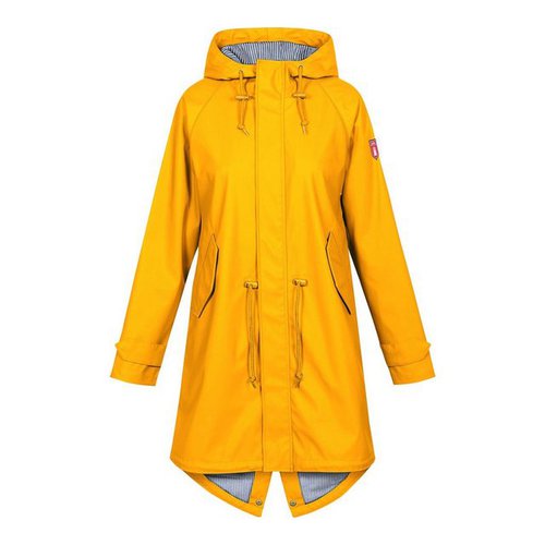Bequeme und wetterfeste Damen-Wetterjacke von derbe.Die Regenjacke Traveby von derbe schützt Sie optimal gegen Regen und Sturm. Damit Sie angenehm trocken und warm bleiben, ist die bequeme Wetterjacke mit Baumwollfutter und PFC-freier Beschichtung winddicht und wasserabweisend und hat an den kritischen Stellen versiegelte Nähte. Zusätzlich können die Ärmelenden durch einen Druckknopf individuell angepasst werden. Der durchgängige Reißverschluss mit Kinnschutz ist vollständig durch eine Druckknopfleiste abgedeckt. Nässe und Wind bleiben dank des hochgeschlossenen Kragens und der Kapuze mit Kordelzug sicher draußen. Zwei seitliche Pattentaschen mit Druckknopfverschluss, Lüftungslöcher unter den Armen und ein Tunnelzug an der Taille runden das durchdachte Design perfekt ab. Optisch glänzt die Jacke entweder im klassischen Gelb, einem dunklen Blau oder natürlichen Grün. Alle Varianten ziert ein rotes derbe-Logo auf dem linken Arm. Der feminine Schnitt bis zur Mitte der Oberschenkel zeichnet sich durch eine verlängerte Rückseite mit hochklappbarem Schwalbenschwanz aus. Produziert wird das Kleidungsstück unter fairen Arbeitsbedingungen mit rein veganen Materialien aus ökologischer oder wiederverwerteter Gewinnung. Freuen Sie sich auf das nächste Schmuddelwetter in Ihrer neuen Regenjacke Traveby von derbe.