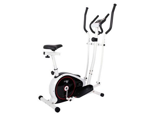 Eigenschaften Heimtrainer und Crosstrainer in einem Trainingsgerät 2in1 Heimtrainer im Sitzen Crosstrainer im Stehen nutzbar Bewegliche Griffarme für vorwärts- und rückwärts Bewegung Extra Haltegriff Computer mit Halterung für Tablet und Smartphone Bluetooth Verbindung: Nein Lautsprecher: Nein Bodenschutzmatte: Separat erhältlich Batterie enthalten Widerstandseinstellung Anzahl der Stufen: 8- stufige Rasterschaltung Art: Manuell Körperanalyse Art der Pulsmessung: Handpulsmessung an den Griffen Empfänger für Pulsmessgurt integriert: Nein Belastbarkeit Geeignet bis zu einem Körpergewicht von max. ca. 100 kg Gerätetyp:CrosstrainerTrainierte Bereiche:Kraft und AusdauerBremssystem:Magnet-Brems-SystemSchwungmasse:ca. 7 kgVerstellbarer Sitz:Horizontal und vertikal (Heimtrainer Funktion)Verstellbarer Lenker:NeinNiveau-Boden-Höhenausgleich:JaSeparater Haltegriff:JaTransportrollen:JaPlatzsparend klappbar:NeinEnergieversorgung:BatterieDisplay Displaytyp: LCD Display mit Halterung für Tablet oder Smartphone Touchscreen: Nein Display beleuchtet: Nein Display höhen- bzw. neigungsverstellbar: Nein Anzeige von: Zeit, Geschwindigkeit, Entfernung, ca. Kalorienverbrauch, Pulsfrequenz und Scan Grenzwerteinstellung: Zeit, Entfernung, ca. Kalorienverbrauch und Pulsfrequenz Überschreitung der Grenzwerte wird angezeigt Aux-In Anschluss: Nein Material Kunststoff, Metall, Gummi Warnhinweis Sportartikel - kein Kinderspielzeug Maße ca. B 66 x H 152 x T 114 cm Gewicht ca. 36 kg