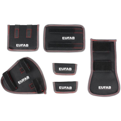 Das Eufab-Fahrrad-Transportschutz-Set 6-tlg. bestehend aus Felgen-, Ketten-, Rahmen-, Pedal- und Gabelschoner zum Schutz des Rades im Fahrzeuginneren oder auf einem Fahrradträger. Die einzelnen Schutzteile werden mit stabilen Klettverschlüssen befestigt, ihre Außenseiten sind abwaschbar und von innen gepolstert. Geliefert wird dieses Set inklusive Tasche zur sauberen Aufbewahrung.