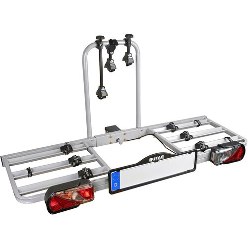 Mit dem Eufab Fahrradträger Bike Three in Silber können Sie bis zu drei Fahrräder zu ihrem Ausflugsziel transportieren. Der Radstopper und die Textilspanngurte mitsamt Gurtführungs-Gummierung sorgen für die sichere und unkomplizierte Ankunft. Die aus Stahl gefertigten V-Schienen können dabei ein Maximalgewicht von bis zu 50 kg tragen. Universell einsetzbarer Fahrradträger für die Anhängerkupplung Der Träger passt auf nahezu alle Anhängerkupplungstypen und ist für Fahrräder mit einem maximalen Radabstand von 120 cm und einer Reifendicke von bis zu 5,6 cm geeignet. Selbst Fahrräder mit Oversize und Y-Rahmen bis 8,5 cm Durchmesser finden auf dem Eufab Fahrradträger problemlos Platz. Die Rückleuchte ist im Lieferumfang enthalten und wird über einen 13-poligen Anschluss mit Strom versorgt. Geringerer Kraftstoffverbrauch und einfache Montage Der Kupplungsträger mit einem Eigengewicht von 17 kg sorgt im Vergleich zu klassischen Dachträgern durch den geringeren Luftwiderstand für einen niedrigeren Kraftstoffverbrauch. In 2010 wurde die Fahrradhalterung neu entwickelt und verfügt seither über eine besonders hohe Passgenauigkeit auf der Anhängerkupplungskugel. Dank der handelsüblichen Schrauben und Muttern ist die Montage besonders einfach. Der passende Schraubenschlüssel ist im Lieferumfang enthalten. Eufab - Fahrradträger-Systeme der Komfortklasse Seit über 20 Jahren kümmert sich Eufab um einen komfortablen Fahrradtransport in Deutschland. Ein umfassendes Produktsortiment bietet einen sicheren Transport von Fahrrädern auf der Anhängerkupplung sowie dem Autodach. Die Neu- und Weiterentwicklung der Produkte hinsichtlich Design, Qualität und Sicherheit machen Eufab zu einer trendorientierten Marke. Produktdetails: - Anwendung: Auf der Anhängerkupplung - Anzahl der Fahrräder: 2 - Schnellverschluss: Nein - Abklappmechanismus mit zusätzlicher Sicherung: Nein - Diebstahlsicherungsmöglichkeiten des Trägers: Optional mit Vorhängeschloss - Befestigung der Fahrräder: Radstopper, Rahmenhalter, Spanngurte - Schienenart: V-Schienen - Beleuchtungs-Anschluss: 13-poliger Stecker - Farbe: Silber - Material: Stahl - Eigengewicht: 17 kg - Maximale Nutzlast: 50 kg - Schienenabstand: 16 cm - Abmessungen des Trägers (H x B x T): 70 cm x 147 cm x 60 cm - Maximaler Radstand: 126 cm - max. Schienenlast Schiene 1: 25 kg - max. Schienenlast Schiene 2+3: 15 kg