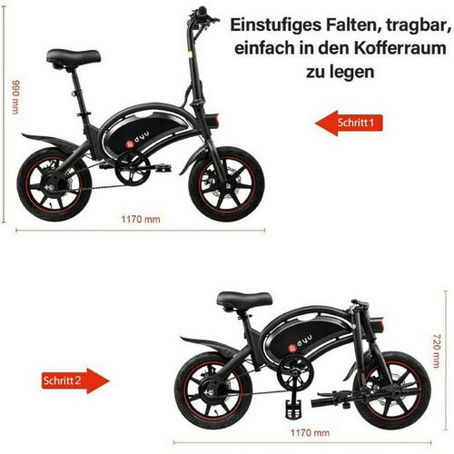 Fangqi E-Bike 14Zoll Klapprad E-BIKE, 250W/10AH,IP54 LED Scheinwerfer,DYU, Kettenschaltung, Heckmotor, (E-fahrräder, E-citybike, E-mopeds), Tempomat, Doppelscheibenbremsen vorne und hinten, Sitzhöhe verstellbar |