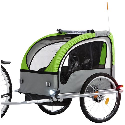 für 1 bis 2 Kinder, mit 4 seitlichen Innenraumtaschen, verstärkter Fußraum, gefedert, zusammenklappbar, passend für alle gängigen Fahrräder von 26 bis 28 Zoll, mit 5-Punkt-Sicherheitsgurten, Feststellbremse, Sicherheitswimpel, inkl. 2 Anhängerkupplungen und LED-Beleuchtungsset - Marke: FISCHER FAHRRAD • Farbe: grün, grau • Gewicht: 18,5 kgTechnische Daten • Zuladung: 23 kgMaßangaben • Reifengröße (Zoll): 20 ZollFunktionen und Ausstattung • Anzahl Sitzplätze: 2 • Ausstattung: Überrollbügel, Federung, Reflektoren, Sicherheitswimpel, 4 seitliche Innenraumtaschen, verstärkter Fußraum, zusammenklappbar • Federung: Ja