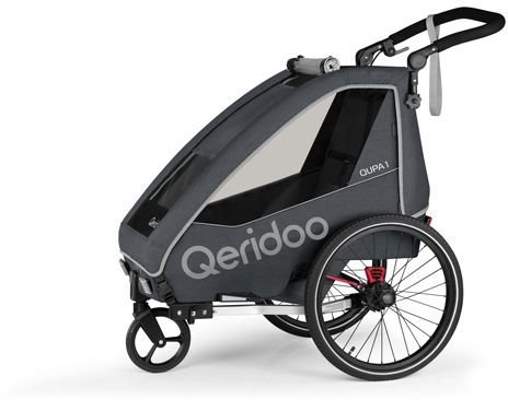 QUPA 1 Der Newcomer Der QUPA setzt auf bezahlbares Design mit Sicherheit. Er ist schick, er ist technisch top, er passt ins Budget und begleitet Dich überall hin – der QUPA ist das neueste Mitglied der Qeridoo Familie und bietet als Einsteigermodell die wichtigsten und beliebtesten Funktionen, gepaart mit der bewährten Qeridoo Sicherheit. Durch das 360-Grad-Buggyrad und die Deichsel mit Universalkupplung wechselst Du binnen kürzester Zeit zwischen Buggy und Trailer-Modus. Nimm ihn mit, wohin Du willst – denn dank des Blattfeder-Dämpf-Systems macht er auch auf unebenen Wegen eine richtig gute Figur. Spezifikationen Länge Trailer-Modus 140 cm Maximale Durchfahrtsbreite 67 cm Höhe Kabine 90 cm Schiebegriffhöhe 68 - 125 cm Verpackungsmaß (LxBxH) 102 x 38 x 57 cm Faltmaße (LxBxH) 105 x 62 x 36 cm Leergewicht Fahrradanhänger 14 kg Maximales Gesamtgewicht 50 kg Kofferraum Volumen 30 l Max. Kindesgröße 105 cm Komfort » Hartgummi-Buggyrad » Höhenverstellbarer Schiebegriff mit Kopfprotektorfunktion » 3-in-1-Verdeck (Insektenschutz, Sonnenschutz und Spritzwasserschutz) » Deichsel mit Universalkupplung und Schnellwechselfunktion » Blattfeder-Dämpf-System » Rückhaltesystem mit 5-Punkt-Sicherheitsgurten » Handparkbremse » Radabweiser mit Schiebefunktion » Vorrichtung für Hängematte / Babyschale » Netztaschen im Kabineninnenraum mit Klett » Netzfach am Kofferraum Lieferung » Kabine + Achse mit Bremszug » Verdeck mit Sonnenschutz » Schiebegriff mit Handschlaufe » 20“ Laufrad (2x) » Hartgummi-Buggyrad » Radabweiser (2x) » Deichsel + Kupplung + Reduzierstück M5 » Wimpel » LED-Rücklicht (exkl. Batterien) » Klettband » Hülsenschraube (1x) » Innensechskantschlüssel Gr. 4 (2x) » Benutzerhandbuch » Garantiekarte » Achs-Finder Sicherheit » Konstruiert und geprüft nach DIN EN 15918 / EN1888 / schadstoffgeprüft » Verstärkter Aluminiumrahmen mit Bodenschutz » Tiefer Schwerpunkt für eine sichere Straßenlage » Rückhaltesystem mit 5-Punkt-Sicherheitsgurten » Heckaufprallschutz » Z-Rückstrahler » Reflektorlinien auf Rädern, Bezug und Verdeck QUPA 1 Grey, Fahrradanhänger, Qeridoo