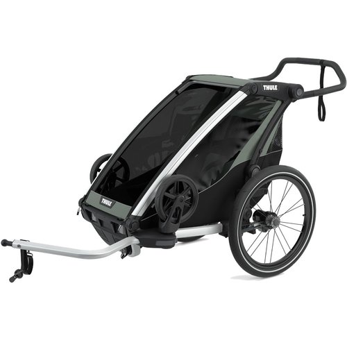 Thule Chariot Lite 1 Multisport-Fahrradanhänger Produktdetails Multisport-Fahrradanhänger für Kinder Art: Einsitzer 4 Aktivitäten: Radfahren, Joggen, Spazieren und Skilanglauf schützt in 4 Jahreszeiten verstaubare Verschlussklappe mit separater Sonnenblende, Insektennetz, Regen- und Windschutz höhenverstellbarer Griff mit weichem Schaumstoffpolster gepolsterter Sitzbereich Rückenbereich mit Netzfenster zur aktiven Belüftung einstellbare Lüftungsschlitze mit abnehmbaren Klemmen sorgen für bessere Belüftung bei Nutzung des Regenverdecks 2 eingesetzte Front-Reflektoren Verstaunetz auf der Rückseite Federung seitlich im Bereich der Hinterräder Rückleuchte für erhöhte Sichtbarkeit und Sicherheit (im Lieferumfang enthalten) Click'n'Store: Befestigungsvorrichtung zum Mitführen des Spazier-, Jogging- und Radfahrsets VersaWing System: schnelles Umrüsten unabhängig vom verwendeten Set schnelles und leichtes Wechseln und Abnehmen der Räder kompakt und schnell zusammenklappbar Logo-Details Lieferumfang: Fahrradanhänger-Set, Buggy-Set, Befestigungsteile, Rückleuchte Technische Daten Farbe: Aluminium/Agave-Black - blasses Agavengrün Sicherheitsgurt: 5-Punkt mit Polstern Tragfähigkeit: 45 Kg Eigengewicht: 12,5 Kg Zusammengeklappt (L x B x H): 87 x 80 x 37,5 cm Radgröße: 20 Zoll Schulterbreite: 57 cm Sitzhöhe: 68 cm kompatible Türbreite: 80 cm kompatible Zubehörteile - können separat nachgekauft werden! Thule Chariot Jogging Kit Thule Chariot Cross-Country Skiing-Set Thule Chariot Infant Sling: Hängematte für Kinder (1-10 Monaten) Thule Baby Supporter: Sitzunterstützung für Kinder (6-18 Monaten) Thule Chariot Brake Kit: Bremsverstärkung Thule Chariot Lock Kit: Sicherungsschloss für Zubehörteile Thule Chariot Padding: zusätzliche Sitzauflage Thule Organizer Sport: Verstautasche mit Getränkehalter Thule Bottle Cage: Flaschenhalterung Thule Cargo Rack: Stauraumerweiterungsnetz Thule Footmuff Sport: isolierter Fußsack Thule Storage Cover: wetterfeste Haube