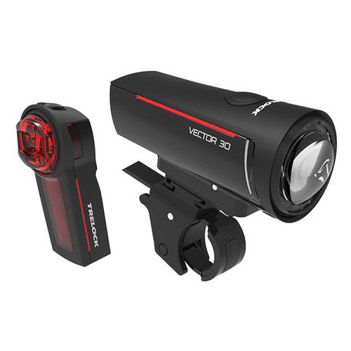 Front+Rücklicht LS300 I-GO Vector Set 30 Lux + USB Front+Rücklicht LS300 I-GO Vector Set 30 Lux + USB – Batterie: 12 & 10 Stunden – Sichtweite: 45 m – Gewicht: 82 & 25 g TRELOCK