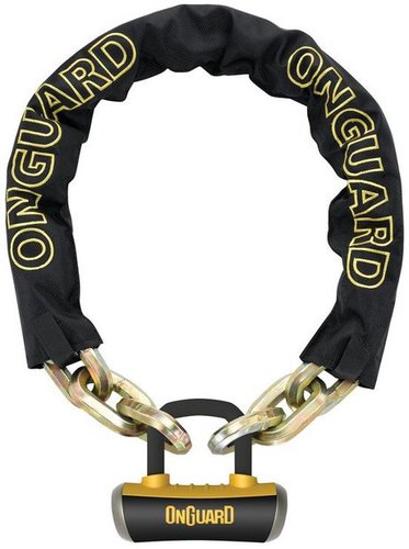 ONGUARD Kettenschloss Beast 8016 Spezifikationen X4P Quattro Bolt Zuhaltung: Z-Zylinder inkl. BumbBlok Schlosskörper mit Gummi-Beschichtung (double rubber coated) Kette aus massiven, gehärteten Stahl, titaniumverstärkt, hexagonale Kettengliedstruktur abgerundetes Design eleminiert Hebelpunkte für Brecheisen Kettencover für otimalen Schutz Inkl. 4 Ersatzschlüssel & 1 LED Schlüssel Gewicht: 5768g Sicherheitsstufe 99 von 100 Länge 110cm, Ø14mm Kettenschloss mit Bügel Beast 8016, Onguard
