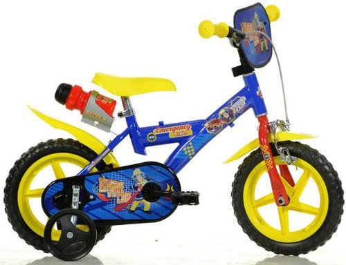 Dino Kinderfahrrad Feuerwehrmann Sam 12 Zoll, 1 Gang, mit Stützrädern, Trinkflasche und Frontschild |