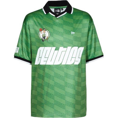 Basketball-Shirt im Design der Boston Celtics; großer Celtics-Schriftzug auf der Vorderseite; Logos an den Ärmeln und auf der Brust; V-Ausschnitt mit geripptem Kragen; Material 100% Polyester.