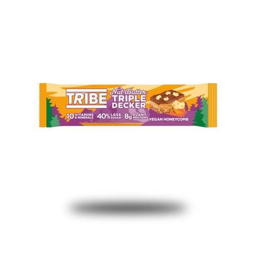 Der 'Nut Butter Triple Decker' ist der geschmackvollste, vegane Proteinriegel Großbritanniens, in der Sorte 'Vegane Bienenwabe', aber natürlich voll vegan. Er besteht aus drei Schichten: knusprige Protein-Müsli-Basis, eine dicke Erdnussbutter-Füllung und ein veganes Schokoladen-Topping.