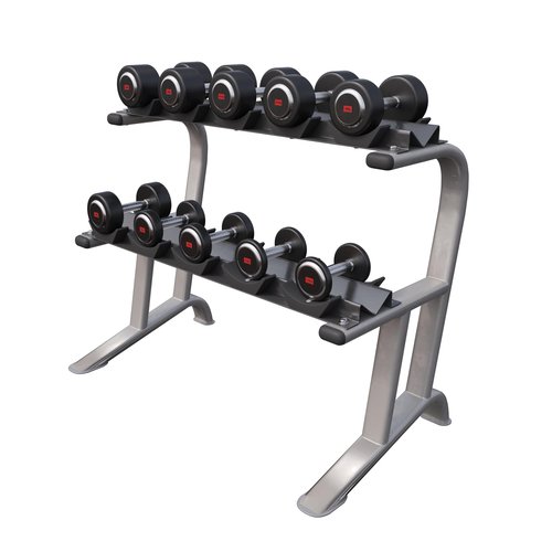 Praktische Kurzhantelablage inkl. Kurzhantel Set Profi Gummi 90 KGSuchst Du beim Training oft nach der passenden Hantel, die irgendwo an deiner Trainingsstätte vergraben ist? Mit der praktischen Kurzhantelablage in Silber sorgst Du in Deinem Home Gym oder Deinem Studio für Ordnung. Die Ablage bietet auf zwei Etagen Platz für bis zu fünf Paar Kurzhanteln. Du legst sie nach dem Gewicht sortiert ab und hast so einen schnellen und präzisen Zugriff auf Deine Kurzhanteln. Die Kurzhantelablage in Silber stellst Du einfach auf den Boden oder auf einen soliden Tisch. Das schicke Design mit den leicht geschwungenen Füßen passt gut in jede Einrichtung. So macht der Sport mit den Gewichten doppelt Spaß!Tolle Qualität für Dein Studio Die Kurzhantelablage wird in ausgezeichneter Qualität geliefert. Sie eignet sich für ein Profistudio ebenso wie für den Heimbereich. Im Lieferumfang sind keine Hanteln enthalten. Folgende Eigenschaften machen dieses Gerät zu einer super Ergänzung für Deine Ausrüstung:2 Plastikablageschalen für 5 Paar Hanteln in universeller GrößeFür Kurzhanteln ab einem Griff-Innenmaß mit 130 mm geeignetSorgt für Ordnung und Freiraum beim Training mit HantelnEinfache MontageMaße (LxBxH): 121 cm x 65 cm x 100 cmFrei und kippsicher aufstellbarMaximal mit 250 Kilogramm belastbarMaterialausführung - Rechteckrohr 80 x 40mmHochwertige und stabile StahlrohrkonstruktionFür Kurzhanteln mit einem Griff-Innenmaß von mind. 130 mm geeignetHinzu kommen im praktischen Set zehn Kurzhanteln Profi Gummi mit Gewichten von 2,5 kg - 15 kg.Kern der Hantel ist aus GusseisenEine dicke Gummischicht dient als UmmantelungBesonders bodenschonend und langlebigKG-Angaben befinden sich auf jeder Hantel