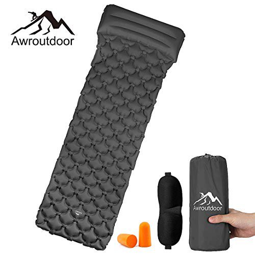 【Professionelle Materialien】:Aus ultraleichtem Ripstop 40D Nylongewebe mit wasserdichter TPU Beschichtung, die Ihnen eine strapazierfähige, abriebfeste, wasserfeste und reißfeste Isomatte bietet.\n【Ergonomisches Design und Komfort】: Das eiförmige Design des isomatte aufblasbar bietet mehr Stützpunkte für die Schwerkraft, um Dellen während des Schlafs zu vermeiden. Passen sich Ihrem Körper an, zu verhindern die Steine, Schlamm und Sandund zu spüren, machen mehr komfort und schmerzlos.\n【Leicht aufzupumpen und zu entlüften】: Superschnelles aufblasen mit 10-15 vollen Atemzügen und Deflation in Sekundenschnelle über das Luftventil. Das große Einwegventil auf dieser Isomatte verhindert, dass es zwischen den atemzügen entleert wird.\n【LEICHTGEWICHT & KLEINES PACKMASS】: Auf Grund des geringen Gewichtes lässt sich nach Zusammenrollen prima auf kleinstem Raum im Rucksack verstauen\n【Vielfältige Funktionen】 : Kann für Camping, Wanderungen, Erholung bei Überstunden am Arbeitsplatz oder sogar als Luftmatratze im Swimming Pool genutzt werden; ein unverzichtbares, funktionales Outdoor-Muss.