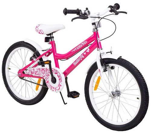 Actionbikes Motors Kinderfahrrad Mädchen Kinder Fahrrad Butterfly 20 Zoll - ab 6 Jahre, 1 Gang, ohne Schaltung, (20 Zoll, ab 115 cm Körpergröße, Freilauf, Kettenschutz, Reflektoren, Luftbereifung, Schutzbleche, Klingel, Katzenaugen, Fahrradständer, 1-tlg., V-Brake-Bremsen, Antirutschgriffe, max. Zuladung 50 kg, pink / weiß), höhenverstellbares Bike Jungen Mädchen Kinderrad ab 6 Jahre |