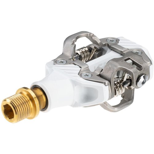 Der CNC-gefräste, keramikbeschichtete Magnesium-Pedalkörper (CeraMAG) und die Achse aus Titan der Güteklasse 5 sorgen für ein geringes Gewicht von nur 298 Gramm pro Paar – das sind etwa 190 Gramm pro Pedal. Das komplett wartungsfähige Dreifachlagersystem besteht aus einer selbstschmierenden LSL-Buchse, einem Nadellager und einem Industrierollenlager. Vier Dichtungen sorgen dafür, dass das Innere unter allen Bedingungen trocken bleibt. Das doppelseitige Clip-in-System passt zu klassischen SPD-Cleats. Das Rückhaltesystem hat eine einstellbare Federspannung, um das Einrasten und Ausrasten fein abzustimmen, und bietet gleichzeitig 5 Grad Spielraum.Details:CeraMAG – keramikbeschichtete Magnesiumlegierung: Sehr leichtes Strukturmetall, hohe Festigkeit, 100 % recycelbarKeramikbeschichtung für maximale Verschleißfestigkeit und KorrosionsbeständigkeitKleine Plattform zur Unterstützung des Schuhs und zur Verbesserung der KraftübertragungTitanschrauben und intensive CNC-Bearbeitung zur GewichtsminimierungUltimative Haltbarkeit mit Vierfach-Lippendichtung und Dreifach-Lagersystem (leichte selbstschmierende Buchse, Nadellager und abgedichtete Kugellager)Beidseitiges Clip-in-RückhaltesystemPositives Einrasten und FeedbackEdelstahlbindungen mit reibungsmindernder BeschichtungGut ablesbarer Spannungsregler für gleichmäßiges Einrasten und Auslösen5 Grad Spielraum, 15 Grad AuslösewinkelEFBE-zertifiziert nach EPAC XC TRI-TEST-Standard (Kategorie 3), getestet für ein maximales Gesamtgewicht von 130 kgGewicht: 149 Gramm pro Pedal, 298 Gramm pro PaarVerwendungszweck: Trail / XC / Gravel / E-Bike