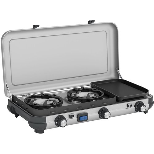 Vielseitiger 2-Flammen-Gaskocher mit zusätzlicher Grillplatte – leistungsstark, kompakt und ideal für Camping & Outdoor-Küche.