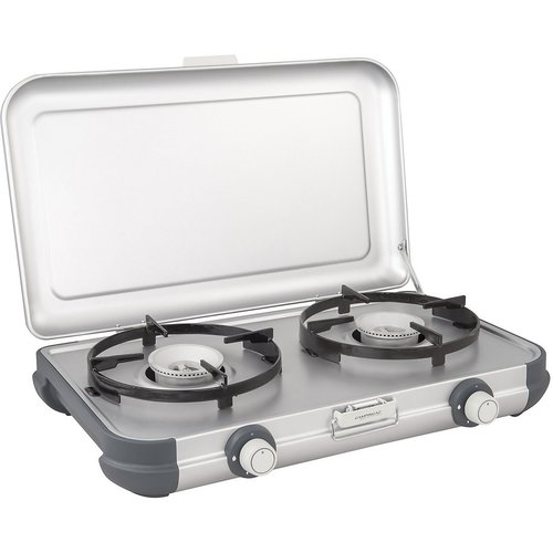 Leichter und kompakter 2-Flammen-Gaskocher mit integriertem Tragegriff – ideal für Campingausflüge mit der Familie.