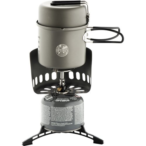 Leichtes, platzsparendes Kochset - bestehend aus Kocher, Topf, Pfanne, Windschutz, Standfuß und Packsack