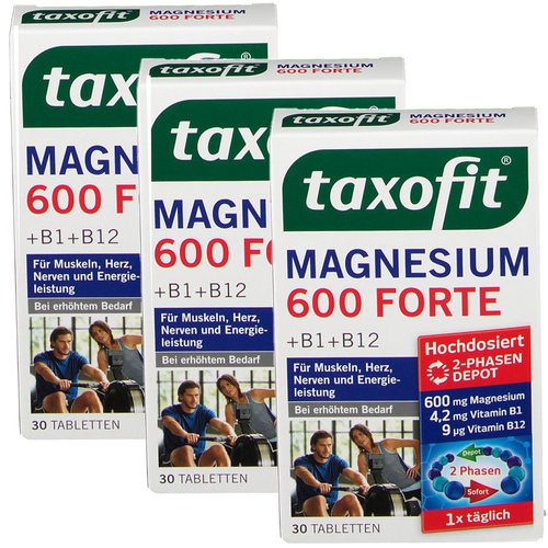 Nahrungsergänzungsmittel sind kein Ersatz für eine ausgewogene und abwechslungsreiche Ernährung und eine gesunde Lebensweise. Intensive körperliche Belastung durch sportliche Aktivität oder den Beruf sowie Stressphasen und die alltäglichen Herausforderungen fordern tagtäglich ein hohes Maß an körperlicher, geistiger und nervlicher Belastbarkeit. Es kann ein erhöhter Bedarf an Magnesium, Vit. B,, B6 und B12 entstehen. Auch bei Jugendlichen während derWachstumsphase, Schwangeren, Stillenden und Personen, die zu Wadenkrämpfen neigen, ist eine ausreichende Vitalstoff-Versorgung wichtig. Diese ist auf Grund unserer häufig unausgewogenen Ernährungsgewohnheiten nicht immer gewährleistet. Zudem können die Vitalstoffe vom Körper nicht selbst hergestellt und nur begrenzt gespeichert werden deshalb müssen sie dem Organismus regelmäßig zugeführt werden. Menschen ab dem 50. Lebensjahr haben zwar keinen erhöhten Bedarf auf Grund ihres Alters, häufig wirken sich aber veränderte Essgewohnheiten ungünstig auf die Vitalstoffzufuhr aus. taxofit® Magnesium 600 Forte Tabletten versorgt den Körper mit einer hoch dosierten und sinnvollen Kombination aus Magnesium sowie den Vitaminen B,, B6 und B'. Es erfolgt durch die 2-Phasen-Freisetzung der Tabletten eine gezielte Versorgung des Körpers: Direkt in der Sofort-Phase und über viele Stunden hinweg in der Depot-Phase. Dem Körper werden die Vitalstoffe so portionsweise zur Verfügung gestelltfür eine gute Aufnahme und Verwertung. Magnesium ist ein lebensnotwendiger Mineralstoff und von elementarer Bedeutung für die Erhaltung wesentlicher Körperfunktionen und Stoffwechselvorgänge. Hierzu gehören die Unterstützung von wichtigen Nerven- und Muskelfunktionen (auch des Herzmuskels) sowie des Elektrolythaushalts, die energieversorgung der Körperzellen, Funktionen in vielen Enzymsystemen und die Verringerung von Müdigkeit und Erschöpfung. Vitamin 81 (Thiamin) trägt zu einer normalen Herzfunktion bei und unterstützt den Energiestoffwechsel (die Energieproduktion und - Ieistung), sowie die Funktionen des Nervensystems. Dies dient vor allem der Übermittlung von Nervenimpulsen. Es unterstützt zudem die normale psychische Funktion. Vitamin 86 (Pyridoxin) ist wichtig für die normalen Funktionen des Nerven- und Immunsystems, für den Energie-, Eiweiß- und Glycogenstoffwechsel sowie für die Bildung roter Blutkörperchen. Diese sind verantwortlich für die Sauerstoffversorgung der Muskulatur. Außerdem hilft B6 ebenso wie Magnesium bei der Verringerung von Müdigkeit und Erschöpfung. Vitamin 812 ist ebenfalls von Bedeutung für das Nervensystem, aber auch für die Zellteilung und die normale Bildung von roten Blutkörperchen. Zudem trägt es zu einem normalen Homocystein-Stoffwechsel bei (Homocystein ist ein Stoffwechselprodukt, das - Ablagerungen- wie z. B. von Cholesterin- in den - Blutbahnen begünstigen kann, deshalb ist ein = normaler Homocysteinstoffwechsel wichtig für die Gesundheit). Mit taxofit' Magnesium 600 Forte leisten Sie einen wichtigen Beitrag zur Versorgung Ihres Körpers -für Muskeln, Herz, Nervensystem, Energieleistung. Zutatenliste: Magnesiumoxid, Magnesiumcarbonat, Füllstoffe (Cellulose, vernetzte Carboxymethylcellulose), Trennmittel (Magnesiumsalze der Speisefettsäuren, Siliciumdioxid, Talkum, Mono- und Diglyceride von Speisefettsäuren), Stärke, Getiermittel Hydroxypropylmethylcellulose, pflanzliches Fett (Palmöl ganz gehärtet), Pyridoxinhydrochlorid, Thiaminmononitrat, Überzugsmittel Speisefettsäuren, Cyanocobalamin, Farbstoff Titandioxid. Ohne: Künstliche Farbstoffe und Aromen, Süßungsmittel, tierische Bestandteile, Gluten, Fructose/Lactose. 1 Tablette enthält durchschnittlich pro 100 g Brennwert 4,9 kJ 1,2 kcal 292 kJ 71 kcal Fett - davon gesättigte Fettsäuren 0,017 g 0,015 g 1,0 g 0,9 g Kohlenhydrate - davon Zucker 0,092 g 0,01 g 5,5 g 0,5 g Eiweiß 0,013 g 0,8 g Salz 0,01 0,25 g Vitamin B1 4,2 mg 0,25 g Vitamin B6 6,0 mg 0,36 g Vitamin B12 9,0 µg 0,0005 g Magnesium 600 mg 36 g Verzehrempfehlung: 1 Tablette täglich mit etwas Flüssigkeit zu einer Mahlzeit unzerkaut schlucken. Kann leicht abführend wirken. Hinweis: Die angegebene empfohlene tägliche Verzehrmenge darf nicht überschritten werden. Aufbewahrungshinweis: Außerhalb der Reichweite von kleinen Kindern aufbewahren. Trocken und nicht über 25°C lagern. Nettofüllmenge 3 x 30 Tabletten Hersteller: MCM Klosterfrau Vertriebsgesellschaft mbH Gereonsmühlengasse 1-11 50670 Köln