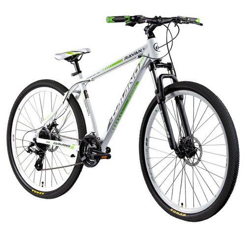 Das Galano Ravan 29 Zoll Hardtail Mountainbike ist ein preisgünstiges, vielseitig einsetzbares Fahrrad für Alltag und Freizeit. Ausgestattet mit soliden Komponenten, ist das Bike dein treuer Begleiter auf dem Weg zu Arbeit, Uni oder Schule und eignet sich genauso für leichtes Gelände. Im Vordergrund stehen dabei harmonische Fahreigenschaften. Der leichte Aluminium MTB Diamantrahmen wird mit einer Federgabel kombiniert, die 100 mm Federweg bietet. Mit dem 600 mm breiten Lenker hast du das Bike in jeder Fahrsituation bestens im Griff. Die 24 Gang Schaltung bietet ausreichend Abstufungen, um ordentlich voranzukommen - egal ob Hügel oder Ebene. Die soliden Komponenten leisten, einmal ordentlich eingestellt, lange Zeit wartungsfrei und zuverlässig ihren Dienst. Gebremst wird mit mechanischen Scheibenbremsen, die sich weder von Schmutz noch von Nässe in ihrer Performance beeindrucken lassen.Das Ravan Mountain Bike fährt auf 29 Zoll Laufrädern mit 2,10“ breiten Stollenreifen. Die großen Räder zeichnen sich durch ruhiges Fahrverhalten und angenehmes Überrollverhalten bei Hindernissen und Schlaglöchern aus. Wir empfehlen das Mountainbike für Personen mit einer Körpergröße zwischen 175 und 190 cm. Das Fahrrad wird zu 85 % vormontiert ausgeliefert. Nach der Montage von Vorderrad, Pedalen und Lenker kann es direkt losgehen.Achtung: Wir weisen darauf hin, dass dieses Fahrrad nicht mit Beleuchtung ausgestattet und damit nicht StVZO-konform ist. Es wird empfohlen, eine entsprechende Nachrüstung vorzunehmen.Technische Daten:Hersteller:GalanoModell:RavanFarbe:schwarz/rot, weiß/grün, schwarz/grün. silberGänge:24Rahmengröße:48 cmLaufradgröße:29 ZollRahmen:Galano Aluminium DiamantrahmenGabel:Zoom Federgabel mit 100 mm FederwegSteuersatz:Neco H846 Stahl Ahead 1 1/8", gewindelosVorbau:Galano Aluminium Ahead, Länge: 90 mm, Klemmung: 31,8 mmLenker:Zoom Aluminium Riser Bar, Breite: 600 mmGriffe:PVC, PAK-freiSchalthebel:Trigger ShifterBremshebel:Aluminium ZweifingertypSchaltwerk:8-fachUmwerfer:3-fachKurbelgarnitur:Galano dreifach, 24-34-42 Zähne, Kurbelarme: 175 mm, mit KettenschutzscheibeKassette:8-fach, 12-28 ZähneKette:1/2", x 3/32", x 110 GliederInnenlager:BB BSA 1,37", x 24T, 68 x 118 mmBremsen:160/160 mm mechanische ScheibenbremsenReifen:29", x 2,10", MTB-Reifen mit StollenprofilFelgen:Galano Aluminium DoublewallNaben:AluminiumSpeichen:32 Stück, rostfreier StahlPedale:Kunststoff PlattformpedaleSattel:Galano MTB-SattelSattelstütze:Galano Aluminium Patentsattelstütze, Durchmesser: 27,2 mm, Länge: 300 mmempfohlene Körpergröße:175 - 190 cmSattelhöhe vom Boden:85 - 107 cmLenkerhöhe vom Boden:107,5 cmzulässiges Gesamtgewicht:120 kgGewicht:17 kgLieferzustand:85 % vormontiert. Lenker, Pedale, Vorderrad und Sattel müssen montiert werdenLieferumfang:1 Fahrrad, Zubehör (Reflektoren, Glocke, Seitenständer)