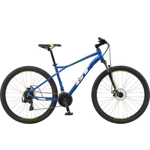 GT Aggressor Sport 29 Zoll Mountainbike Hardtail MTB Fahrrad 29", Mountain BikeDas GT Aggressor Sport Hardtail Mountainbike kommt auch 2021 in einer frisch überarbeiteten Version mit neuen Farben wieder. Das 29 Zoll Bike ist dein zuverlässiger Begleiter im Alltag, auf Wochenendtouren und im Gelände. Der Aluminiumrahmen besitzt das GT Triple Triangle Design, das dank bester Balance und Verwindungssteifigkeit für ein ausgewogenes Fahrgefühl sorgt. Das Material selbst ist leicht und robust und kann so einiges ab. Der Rahmen unterstützt eine moderat sportliche Sitzposition, die durch den breiten, leicht gekröpften Lenker positiv beeinflusst wird. Flexende Sitzstreben fangen Vibrationen des Untergrunds ab und verbessern dein Sitzgefühl immens. Zusätzlich bietet die SR Suntour Federgabel 75 mm Federweg, mit denen sie Stöße abmildert. Mit 21 Gängen bietet dir dieses MTB eine feine Gangabstufung an, mit der du deine Übersetzung an jede Geländeanforderung genau anpassen kannst. Schaltwerk und Umwerfer stammen aus der Baugruppe Shimano Tourney, die sich durch Langlebigkeit und Robustheit auszeichnet. Einmal richtig eingestellt, liefern die Komponenten zuverlässig und wartungsarm ihre Leistung. Geschaltet wird über einen Shimano Tourney Schalthebel. Mit den mechanischen Scheibenbremsen von Tektro bist du auf dem Aggressor Sport jederzeit in der Lage, dein Bike präzise zu kontrollieren. Scheibenbremsen liefern auch bei Nässe und Verschmutzung unbeeindruckt ihre kräftige Bremsperformance und sind daher genau richtig am Mountainbike. Für den passenden Bodenkontakt sorgen die WTB Ranger Comp Reifen mit ihrem griffigen DNA-Compound und den passend für den Offroad-Einsatz angeordneten Stollen, die überall besten Halt finden. Die 2,25 Zoll breiten Reifen kommen auch mit ebenen, asphaltierten Straßen bestens klar. Sie sitzen auf Aluminium Doublewallfelgen, die ebenfalls von WTB stammen und hinsichtlich Gewicht und Verwindungssteife auf die Anforderungen des Mountainbikens bestens vorbereitet sind. Mit Laufradgröße 29 Zoll bist du mit hoher Laufruhe und bestem Überrollverhalten unterwegs. Die Räder rollen nahezu unbeeindruckt über Steine, Wurzeln und Schlaglöcher, dabei bringen sie viel Vortrieb mit. Optisch eignen sie sich hervorragend gerade für großgewachsene Fahrer, denn das Gesamtbild sieht mit großen Rädern stimmiger aus. Wir empfehlen das GT Aggressor Expert für Fahrer zwischen 165 cm und 195 cm Körpergröße. Aus drei Rahmenhöhen kannst du die auswählen, die am besten zu dir passt. Damit es ohne lange Bastelei gleich losgehen kann, werden alle Fahrräder bereits zu mindestens 85 % vormontiert ausgeliefert. Achtung: Wir weisen darauf hin, dass dieses Fahrrad nicht mit Beleuchtung ausgestattet und damit nicht StVZO-konform ist. Es wird empfohlen, eine entsprechende Nachrüstung vorzunehmen.Technische Daten:Hersteller:GTModell:Aggressor SportFarbe:rot, blauGänge:21Rahmengröße:46 cm, 50 cm, 54 cmLaufradgröße:29 ZollRahmen:Aluminium Triple Triangle Sloping-Rahmen mit flexenden SitzstrebenGabel:SR Suntour M3030 Federgabel mit 75 mm FederwegSteuersatz:halbintegriert, abgedichtet, cartridgeVorbau:GT All Terra Aluminium 1 1/8",, 31,8 mm, Winkel: 8°Lenker:GT All Terra Aluminium Riser bar, Breite: 720 mm, Rise: 25 mm/6°, Sweep: 8°Griffe:GT StatementSchalthebel:Shimano Tourney SchalthebelBremshebel:Aluminium DreifingertypSchaltwerk:Shimano Tourney 7-fachUmwerfer:Shimano Tourney 3-fachKurbelgarnitur:Prowheel Aluminium dreifach, 42-34-24 ZähneKassette:SunRace 7-fach, 14-34 ZähneKette:KMC Z7Innenlager:Cartridge, VierkantBremsen:Tektro 160/160 mm mechanische ScheibenbremsenReifen:WTB Ranger Comp 29", x 2,25", mit DNA CompoundFelgen:WTB SX19, 32 LochNaben:Aluminium QRSpeichen:14G, rostfreier StahlPedale:GT Slim Line PlattformpedaleSattel:GT MTBSattelstütze:GT All Terra Aluminium Patentsattelstützeempfohlene Körpergröße:RH 46: 165 - 180 cmRH 50: 170 - 185 cmRH 54: 180 - 195 cmzulässiges Gesamtgewicht:120 kgGewicht:15 kgLieferzustand:85 % vormontiertLieferumfang:1 Fahrrad, Zubehör (Reflektoren, Glocke)