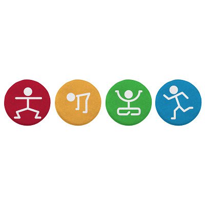 Achoka Bewegungspunkte Activity Dots für Aktivität und Abwechslung - Die Bewegungspunkte Activity Dots von Achoka sind gute Hilfen für den Kindersport. Legen Sie die Markierungen für einen Bewegungsparcours aus. Auf den 8 Bodenmarkierungen sind stilisiert verschiedene Übungen abgebildet. Die unterschiedlichen Farben der Bewegungsfliesen (Rot, Orange, Grün, Blau) bieten weitere Möglichkeiten – wie z. B. wenn Sie Farbenwürfel zur zufälligen Wahl der Übungen verwenden.