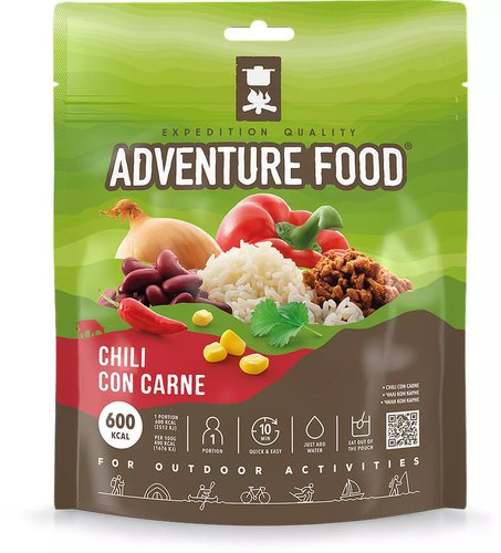 Würzig-scharf! Die Trek'n Eat Trekkingmahlzeit Chili con Carne mit Rindfleisch gibt nach einem anstrengenden Tag auf Tour wieder Energie und erfreut die Geschmacksknospen mit angenehmer Würze. Die gefriergetrocknete Unterwegsnahrung wird einfach mit heißem Wasser direkt im Beutel angerührt. Dann wartet man nur ein paar Minuten und fertig ist eine heiße, sättigende und leckere Mahlzeit. Die 180g-Packung reicht für 1 Person am Ende einer normalen Tagesetappe.