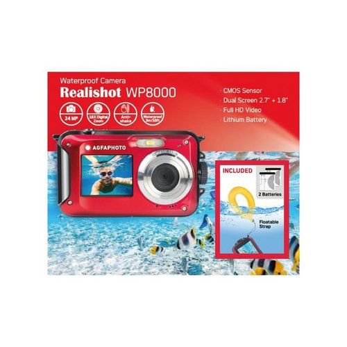 AGFAPHOTOKompaktkameraWP8000 rot Kit mit Schwimmgriff und zweitem AkkuCMOS-Senosr mit 24,0 MegapixelDigit. Zoom 16-fachDual screen 2.7’’ and 1.8’’Wasserdicht bis zu 3mLithium BatterySchwimmgriff und zusätzlicher Akku im Lieferumfang enthalten