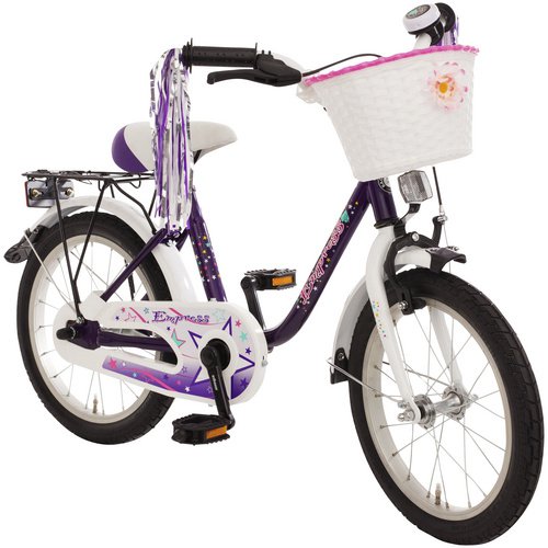 Thun Tretlager, rundum geschlossener Kettenkasten, Reflektoren vorne u. hinten, Lenkerkorb, Vorbaupolster - Marke: BACHTENKIRCH • Farbe: weiß, lila • Serienname: Empress • Farbe: lila, weiß • Höhe: 63 cm • Gewicht: 10 kg • Länge: 106 cm • Reifengröße (cm): 40,64 cm • Rahmenhöhe: 29 cm • Reifengröße (Zoll): 16 Zoll • Herstellerfarbbezeichnung: lila/ weiß Technische Daten • Anzahl Gänge: 1 • Bauart Dynamo: ohne Dynamo • Bauart Gabel: Starrgabel • Bauart Lenker: Kinderlenker • Bauart Rahmen: U-Type Rahmen • Bauart Sattelstütze: Kerzensattelstütze • Bauart Vorbau: Standard • Beleuchtung hinten: ohne • Beleuchtung vorne: ohne • Bremssystem hinten: Rücktrittbremse • Bremssystem vorne: V-Bremse • Felge: Aluminium-Felgen • Kettenblattgarnitur: 1-fach • Kettenschutz: Geschlossener Kettenkasten • Nabe hinten: Stahl • Nabe vorne: Stahl • Pedale: Kunststoff-Pedale • Sattelart: Kunststoffsattel • Schaltungstyp: ohne • Speichen: stahl • Ständer: Seitenständer • Sattel Polsterung: Schaumstoff • Griffe: Sicherheitsgriffe • Art Leuchtmittel Rücklicht: Reflektor • Art Leuchtmittel Frontlicht: Reflektor • Reifen: Ballonreifen • Steuersatz: kugelgelagert Maßangaben • Zulässiges Gesamtgewicht: 50 kgMaterialangaben • Material Felge: Aluminium • Material Gabel: Stahl • Material Lenker: Stahl • Material Rahmen: Stahl • Material Sattelstütze: Stahl • Material Schutzbleche: Stahl • Material Vorbau: Stahl • Material Ständer: Stahl Funktionen und Ausstattung • Ausstattung gemäß StVO: Nein • Fahrradkorb: Nein • Federung: Nein • Gepäckträger: Ja • Klingel: Ja • Lenkerpolster: Ja • Schutzbleche: Ja • Reflektoren: vorhanden • Stützräder: Nein • Ausstattungsdetails: Reflektoren | Glocke | Vorbaupolster | Rundum geschlossener Kettenkasten | Kantenschutz an Schutzblechen | Alu-Seitenständer | Kunststoff-Lenkerkorb | Lenker-Streamer Hinweise • Aufbau: zu 98% vormontiert Lieferung • Lieferumfang: inkl. Alu-Seitenständer