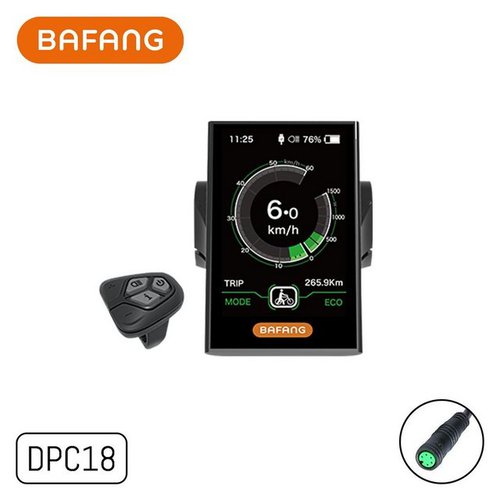 Eigenschaften5 einstellbare UnterützungsstufenUSB Anschluss mit LadefunktionEinstellbare Max. Geschwindigkeit: 12-90 km/hGeschwindigkeitsanzeige: Momentan / Durchschnitt / MaximalKilometerzähler: Aktuelle Fahrt / Insgesamt / Elektr. ReichweiteBafang Kompatibilität: BBS01 / BBS02 / BBSHD und Bafang ControllerAnzeige Energieverbrauch: echtzeit, analog oder digitalWeitere Features: Fehlercode-Anzeige / Passwortschutz / Uhrzeit / Schiebe – Modus / Licht An-Aus / Auto AusSystemspannung: 36V / 43V / 48VLenkerdurchmesser: 31,8mm Display, 22,2mm SteuerelementBetriebstemperatur: -20°C bis +,45°CBetriebsstrom: 40mAMax. Betriebsstrom 100mAWasserdichtigkeit: IP 65 StandardKommunikationsprotokoll: UARTProduktbeschreibungDas Bafang DPC-18 Display bei windmeile© verfügt über eine Vielzahl von Funktionen, um Ihnen alle wichtigen Informationen schnell zu liefern, so können Sie problemlos Ihre Lichter bedienen, die richtige Unterützungsstufe wählen oder die maximale Geschwindigkeit einstellen. Unter anderem bietet der kontrastreiche und kratzfeste IPS-Matrix Bildschirm 3 Geschwindigkeits-Anzeigemodi, einen Kilometerzähler, eine Energieverbrauchsanzeige und weitere Features, wie die Anzeige der Uhrzeit. Das Display hat außerdem einen USB Anschluss mit Ladefunktion. Um auch unter schwierigen Lichtverhältnissen eine gute Bedienbarkeit und Sichtbarkeit zu ermöglichen, ist der Bordcomputer beleuchtet. Er verfügt über eine Kabellänge von ca. 0,23m und ist kompatibel zu den Bafang BBS01, BBS02 und BBSHD Motoren und den Bafang Controllern. Das LCD-Display ist geeignet für eine Systemspannung von 36V, 43V und 48V, die Betriebstemperatur reicht von -20°C bis +,45°C. Zudem besitzt das Farbdisplay eine Wasserdichtigkeit nach dem IP 65 Standard. Das Display passt auf Lenker mit 31,8mm oder mit den gelieferten Reduzierstücken auf 22,2mm, das Steuerelement hat einen Durchmesser von 22,2mm.LieferumfangBafang DPC-18 DisplayHalterung für FahrradlenkerSchrauben und Transferringe