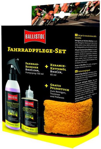 BALLISTOL Fahrrad-Pflege-Set Das BALLISTOL Fahrrad-Pflege-Set ist die ideale Lösung für die umfassende Pflege Ihres Fahrrads. Es enthält alle wichtigen Utensilien, die Sie zur Reinigung, Pflege und zum Schutz Ihres Fahrrads benötigen. Das Set besteht aus einem hochwertigen Fahrradreiniger, einem Keramik-Kettenöl und einem Mikrofaser-Pflegetuch, das perfekt für das Reinigen, Trocknen und Polieren geeignet ist. Mit der praktischen Eurolochung lässt sich das Set einfach verstauen oder aufhängen. Ob für die regelmäßige Pflege oder als Set für unterwegs – das BALLISTOL Fahrrad-Pflege-Set ist vielseitig einsetzbar und sorgt dafür, dass Ihr Fahrrad optimal gewartet bleibt. Produkteigenschaften: Enthält alle wichtigen Pflegeutensilien für Fahrräder Fahrradreiniger (150 ml): Reinigt effektiv alle Teile des Fahrrads Keramik-Kettenöl (65 ml): Sorgt für optimale Schmierung und Schutz der Kette Mikrofaser-Pflegetuch (30 x 30 cm): Ideal zum Reinigen, Trocknen und Polieren Praktische Eurolochung für einfaches Verstauen Gesamtinhalt: 150 ml Fahrradreiniger, 65 ml Keramik-Kettenöl Gesamtgewicht: 0,241 kg Lieferumfang: 1 x Fahrradreiniger, 150 ml 1 x Keramik-Kettenöl, 65 ml 1 x Mikrofaser-Pflegetuch (30 x 30 cm) Fahrrad-Pflege-Set, Ballistol