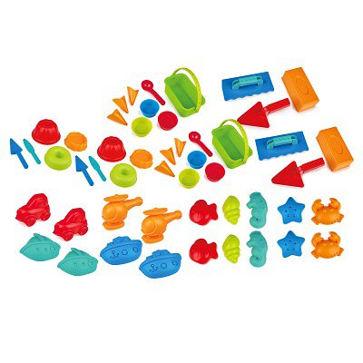 Beleduc Sandspiel-Set Formen und Bauen: Vielfalt für den Sandkasten - Das Beleduc Sandspiel-Set Formen und Bauen besteht aus 50 Teilen aus hochwertigem Kunststoff. Kinder können mit Sand dank einer Vielzahl von Formen und Werkzeugen gestalten und spannende und lustige Rollenspiele erleben. Zufällige Farbauswahl. Themenbereiche sind Bau, Eisdiele und Backstube. - Bestandteile Beleduc Sandspiel-Set Formen und Bauen: - 2 Sandspielzeug-Messer - 2 Sandspielzeug-Tortenheber - 6 Sandformen Kuchen - 6 Sandformen Eiswaffel - 2 Sandformen Eis-Portionierer - 2 Sandspielzeug-Tragekörbe - 6 Sandspielzeug-Eisbecher - 2 Sandspielzeug-Glättekellen - 2 Sandspielzeug-Mauerkellen - 2 Sandformen Mauersteine - 2 Sandformen Auto - 4 Sandformen Schiffe - 2 Sandformen Hubschrauber - 2 Sandformen Fische - 2 Sandformen Meeresschnecke - 2 Sandformen Seepferdchen - 2 Sandformen Seestern - 2 Sandformen Krebse