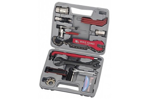Der Bike Hand YC-737 Werkzeugkoffer ist ein unverzichtbares Tool-Set für jeden, der sein Fahrrad selbst warten möchte. Das Set enthält 13 Werkzeuge, die für die meisten üblichen Reparaturen ausreichen. Mit dem Set kann man das Innenleben des Fahrrads warten, z.B. das Innenlager, den Kurbelabzieher oder das Zahnkranzabzieher werkzeug.Eine Besonderheit des Sets ist der Multifunktionswerkzeug, bei dem man mit nur einem Werkzeug verschiedene Schrauben lockern oder festziehen kann. Es gibt auch einen Reifenheber, um eine Reifenpanne schnell zu beheben. Und falls man unterwegs eine Panne hat, gibt es auch einen Flickzeug, das im Set enthalten ist.Der Bike Hand YC-737 Werkzeugkoffer hat eine kompakte Größe und ist leicht zu transportieren. Es ist geeignet für alle Fahrradtypen und einfach zu handhaben. Dieses Tool-Set ist bei Rad-Enthusiasten beliebt und sollte in keinem Haushalt fehlen, in dem Fahrräder gewartet werden müssen.