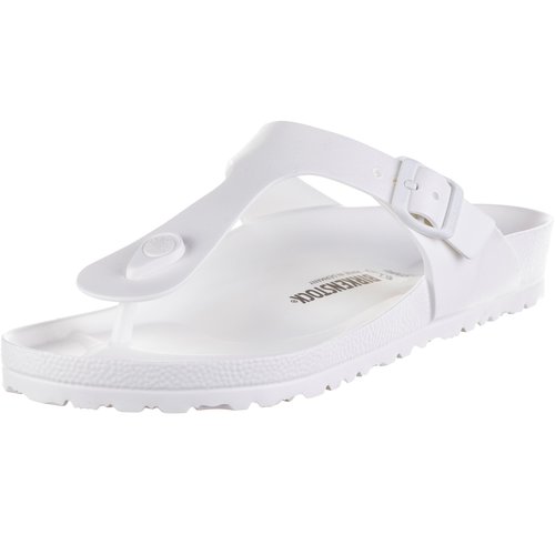 Wasserfeste Zehensandalen aus dämpfendem EVA; Zehensteg aus Kunstoff; seitlich in der Weite durch Schnalle verstellbar; anatomisch geformtes Fußbett; rutschfeste Außensohle; hochelastisch; abwaschbar; leicht; Weite: schmal–normal.