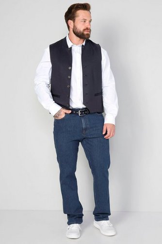 Boston Park Weste aus feinem Web mit 2 Leistentaschen. Mit Collegekragen und kleinem Revers. Knopfleiste. Futterrücken - perfekt auch zum Unterziehen. Boston Park - stilvoll in jeder Größe.