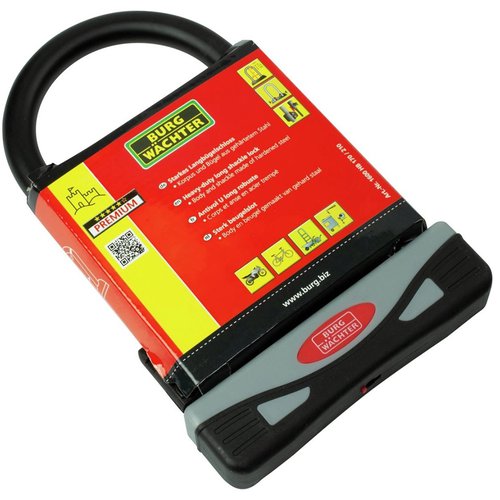Korpus und Bügel des Burg-Wächter Langbügelschlosses 1600 HB bestehen aus gehärtetem Stahl. Die Bügelhöhe des doppelt verriegelten Bügels beträgt 210 mm, die Bügelweite 106 mm. Mit 1520 Gramm und einer Bügelstärke von 16 mm setzt es Aufbruchsversuchen einen massiven Widerstand entgegen. Für Langlebigkeit und Komfort sorgen die Ummantelung aus strapazierfähigem Kunststoff und die bewegliche Schutzkappe für das Schließwerk. 2 Schlüssel sind im Lieferumfang enthalten.